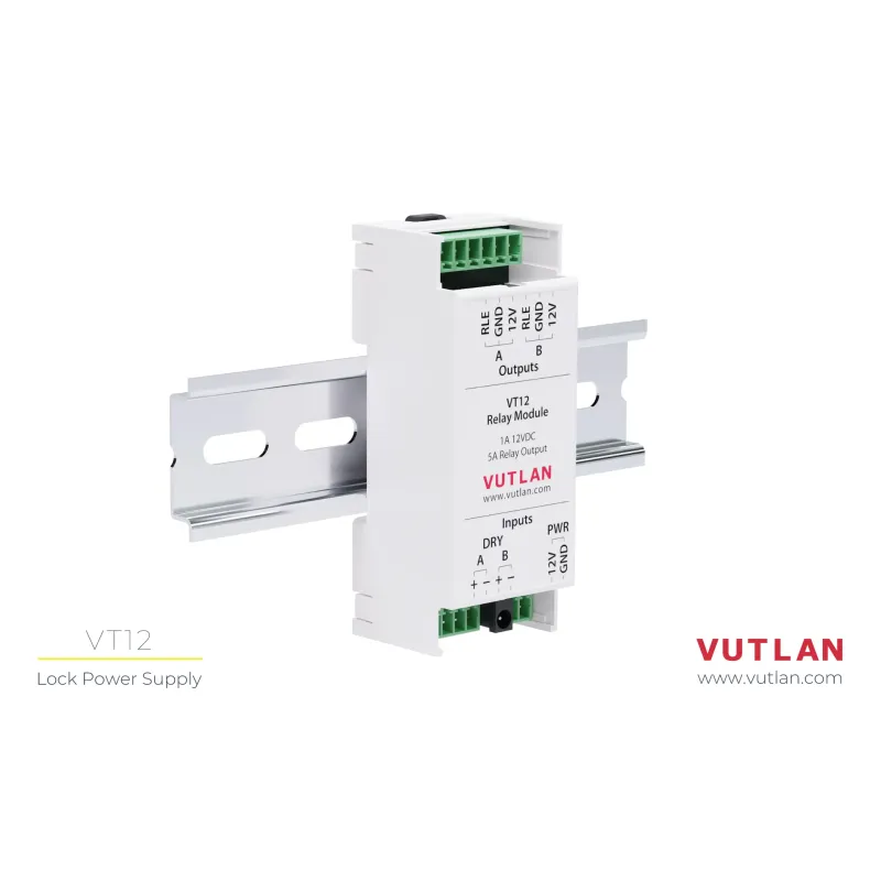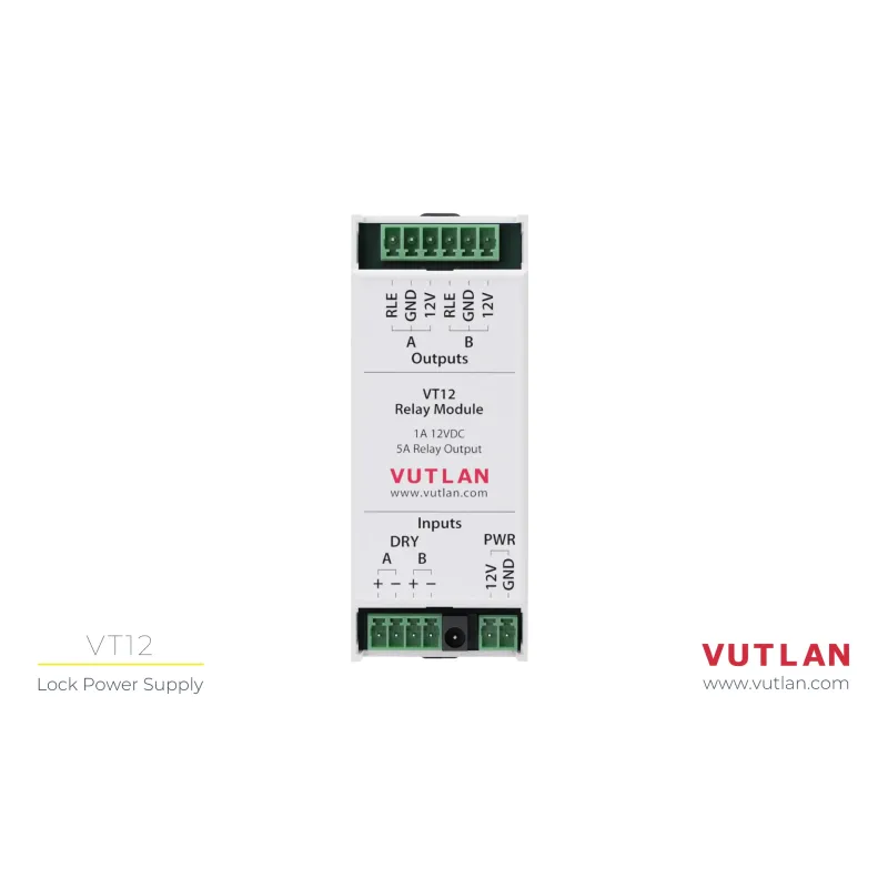VT12 Relay Module is a dual-channel switching unit designed to turn on/off loads. It can be connected to the dry contacts outputs of VT855 and VT336 Vutlan monitoring units to turn on/off loads with current up to 1A, when the device's Dry contact output is triggered.
