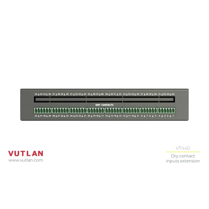 The VT440 expansion module increases the number of dry contacts that can be connected to any Vutlan monitoring device.Each VT440 module has 32 dry contacts, which can be expanded to 64 using the "VT32 / Dry Contact Board".